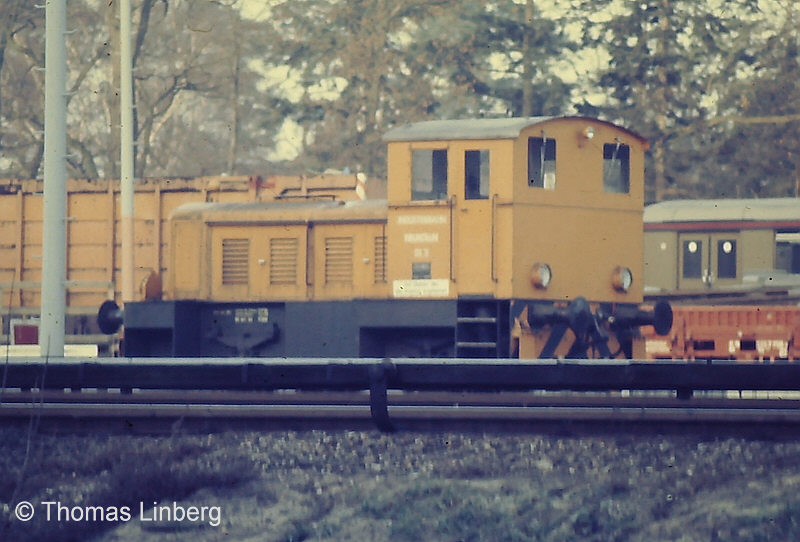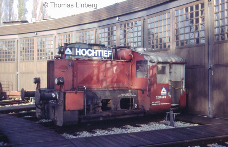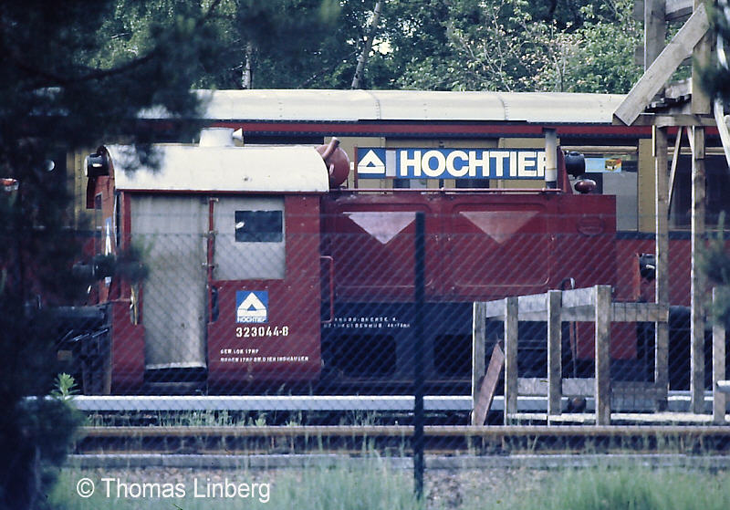 ![]() 323 044-8 Fa. Hochtief ex DB 323 044-8 (+31.12.79) ex DRB Köf 5116 Herst. KHD 1943/47294 Verbleib: 1989 Abgabe an das Museum für Verkehr und Technik (MVT), Berlin Berlin-Wannsee, 01.06.1986 |