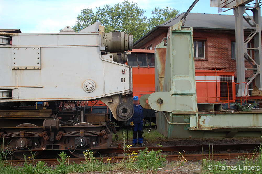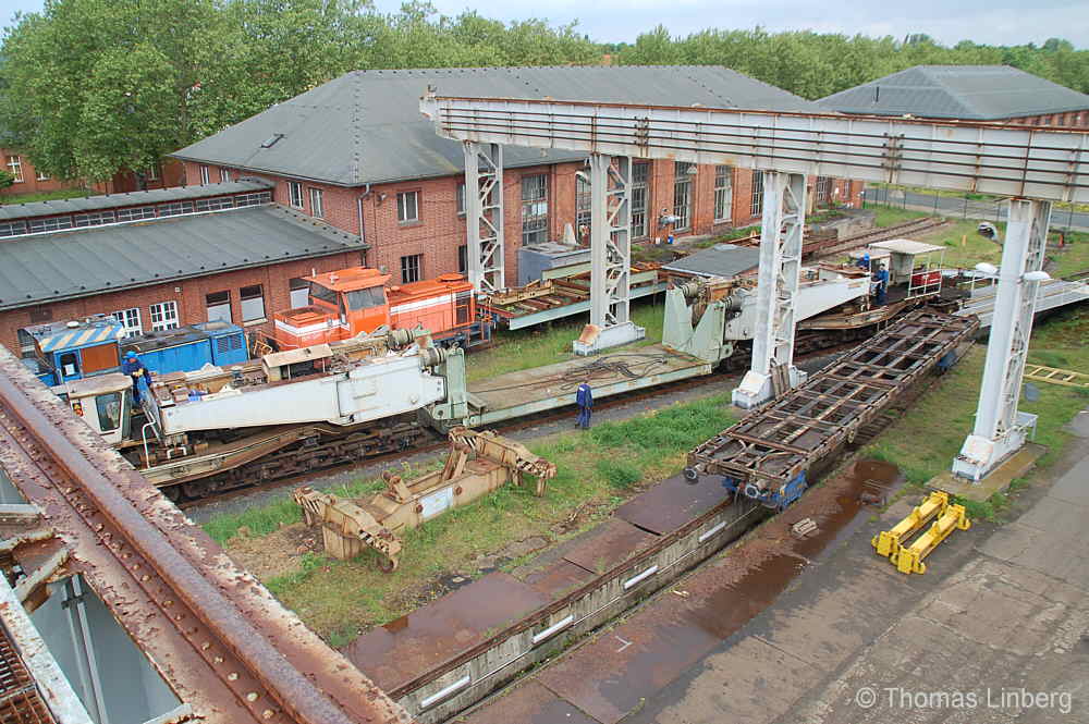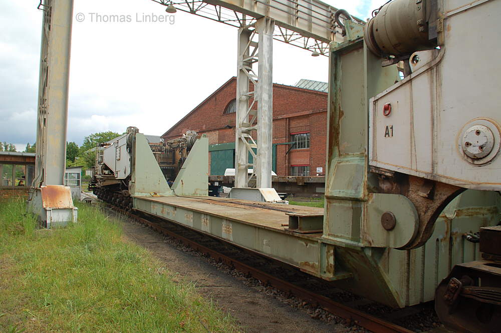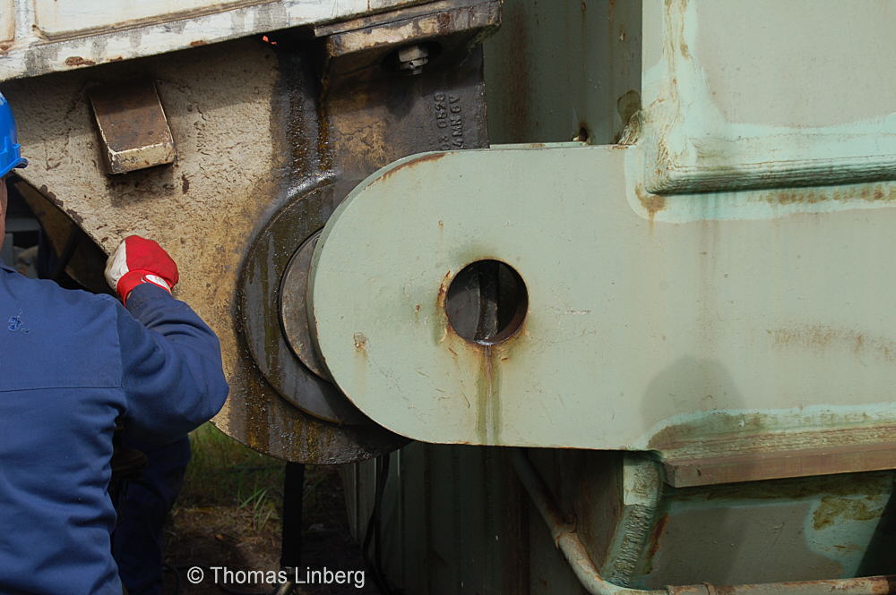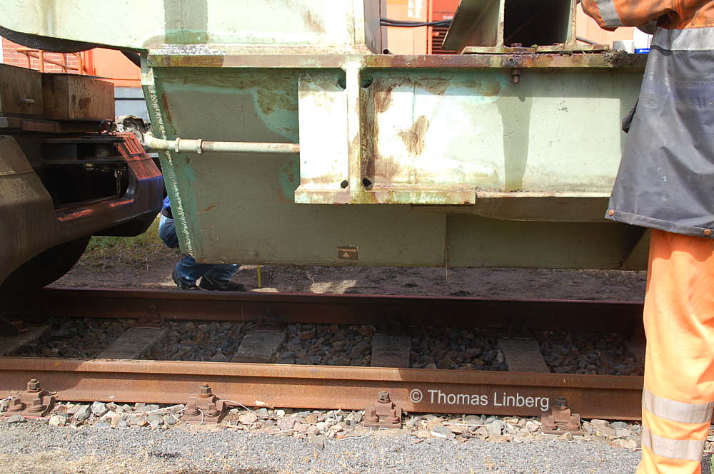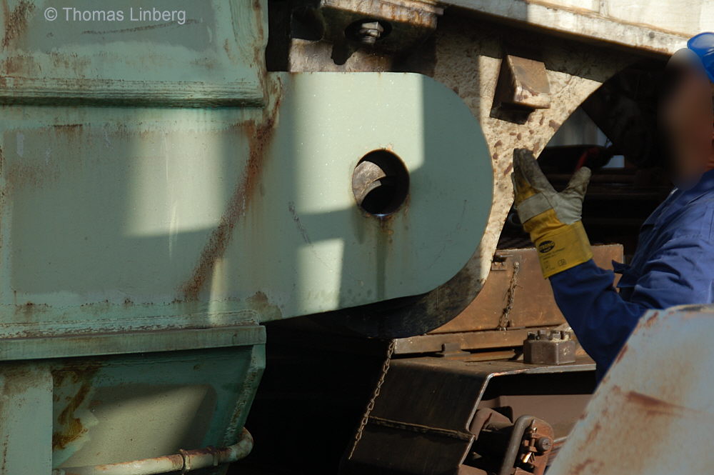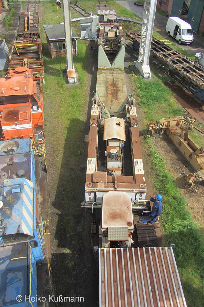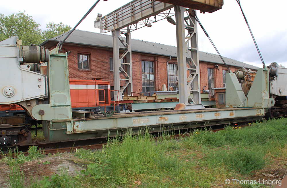 Bislang konnten die mit den Uaai 831 zu transportierenden Lasten entweder freitragend oder mit Durchladeträger transportiert werden. Am 13.05.2014 wurde in Brandenburg-Kirchmöser der Wagen 996 0 404 für einen Einsatz in Polen vorbereitet. Dazu wurde erstmals (ausgenommen von probeweisen Einbauten) ein Tiefbett eingebaut. Dieses wurde von MAN - Werk Gustavsburg - gebaut und hat bei einer Gesamtlänge von 11,9 m und einem Eigengewicht von 38,0 t eine maximale Tragfähigkeit von 190 t. Die Ladelänge beträgt 10,0 m und die Ladebreite 2,8 m. Das Tiefbett stammte ursprünglich vom Uaai 685.9 996 0 000, ist aber auch zur Verwendung mit den Uaai 684.9 und 687.9 zugelassen.. Nachfolgend zeige ich eine Bilderserie des Einbaus: Die beiden Hälften des Tragschnabelwagens sind bereits auseinandergezogen ... ![]() ... und während eine Hälfte wartet ... ![]() ... wird an der anderen Hälfte schon der Einbau des Tiefbetts vorbereitet. Das Tiefbett hängt an der Traverse der 100t-Kranbahn der GBM Gleisbaumechanik ... ![]() ... und wird Zentimeter für Zentimeter in Position gebracht. ![]() Noch ein Stück vor ... ![]() ... noch ein Stück tiefer ... ![]() ... zum Schluss geht es um Millimeter ... ![]() Passt! Bolzen rein! Festschrauben! Fertig! ![]() Die andere Hälfte ... wartet ![]() Für uns die nicht alltägliche Gelegenheit mal einen Blick ins "Innere" eines Tragschnabels zu werfen. ![]() Alles Warten hat ein Ende! Die zweite Hälfte ist an der Reihe und bewegt sich per Seilwinde und Muskelkraft Richtung Tiefbett ![]() Stück für Stück ... ![]() ... nähern sich Tragschnabel und Tiefbett Dann ist wieder Maßarbeit gefragt ... ![]() ![]() ![]() ![]() ... bis auch hier der Bolzen passt. ![]() So sieht die komplette Einheit aus, aber ... ![]() ... noch hängt das Tiefbett am Haken. ![]() Die Kopfpressen liegen an ... ![]() ... und so spricht nichts dagegen, das Tiefbett vom Haken zu lassen. Anschließend wurden noch einige Funktionsprüfungen durchgeführt ![]() Die tiefste Stellung - es fehlen nur Millimeter bis zur Schienenoberkante ... ![]() ... und eine höhere Stellung des Tiefbetts, wobei in dieser Position die höchste Stellung aber noch nicht erreicht ist. Außerdem wurde auch der Diagonalverschub gestestet. ![]() Eine Wagenhälfte verschiebt sich um maximal 450 mm zur einen Seite, die andere Wagenhälfte um maximal 450 mm zur anderen Seite. Zu erkennen ist das an den Bedienständen, die nicht mittig vor den "Wellblechdächern", sondern nach rechts bzw. links verschoben stehen. Vielen Dank an Heiko Kußmann für das Bild. ![]() Vorbehaltlich der Endabnahme kann das Fahrzeug zusammen mit dem frisch untersuchten und neu lackierten Begleitwagen 55 80 99-43 015-6 Dienst ümh 472 auf die Reise nach Polen gehen, um dort einen 150t-Trafo zu transportieren. Ich bedanke mich ganz herzlich bei der Nuclear Cargo + Service GmbH (NCS) und der GBM Gleisbaumechanik Brandenburg/H. GmbH (GBM), die mir die fotografische Begleitung dieser Umbauaktion ermöglichten. |