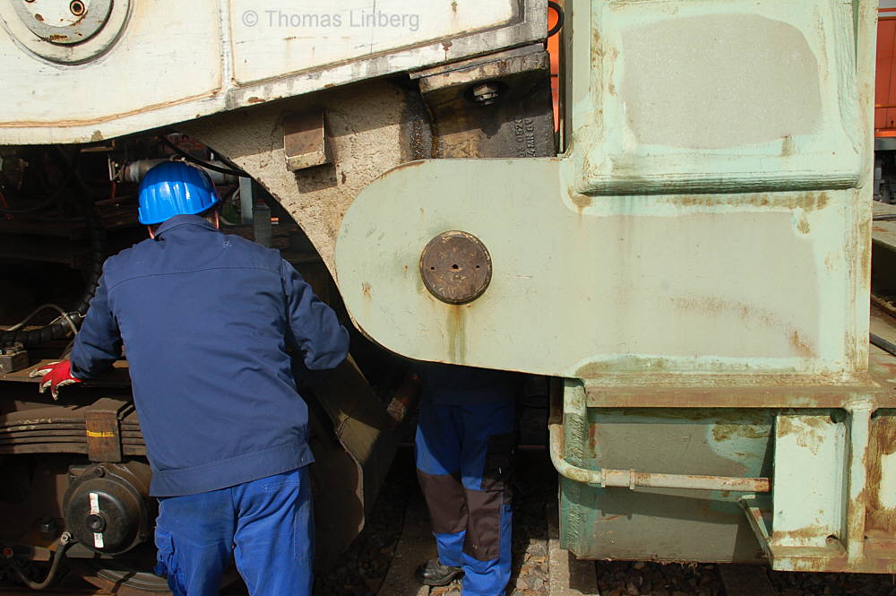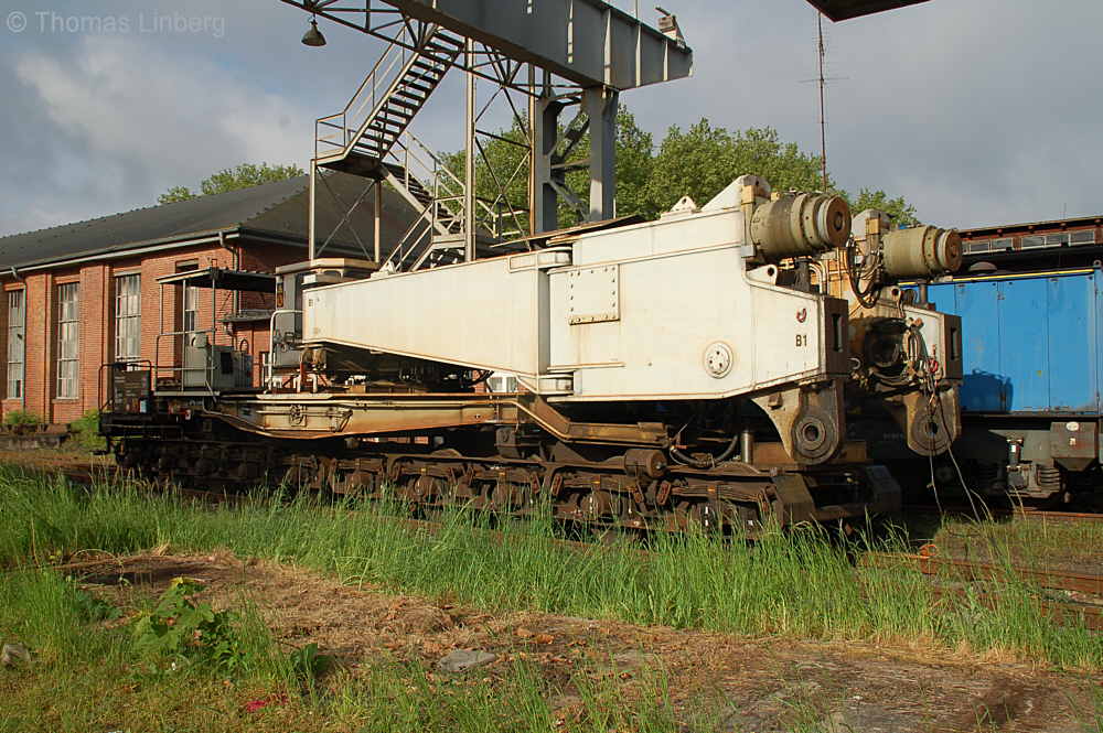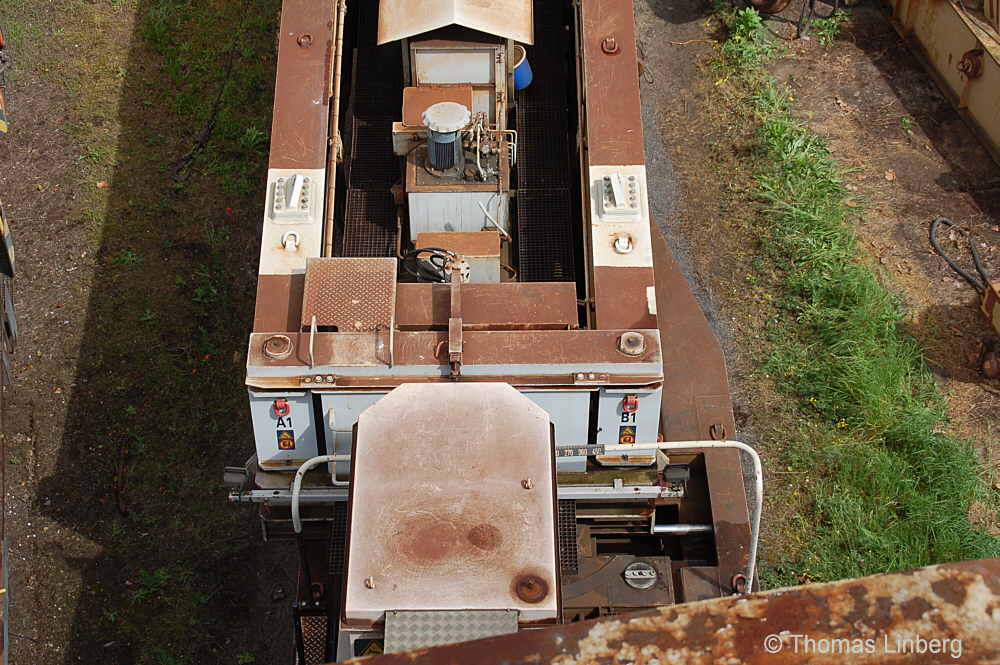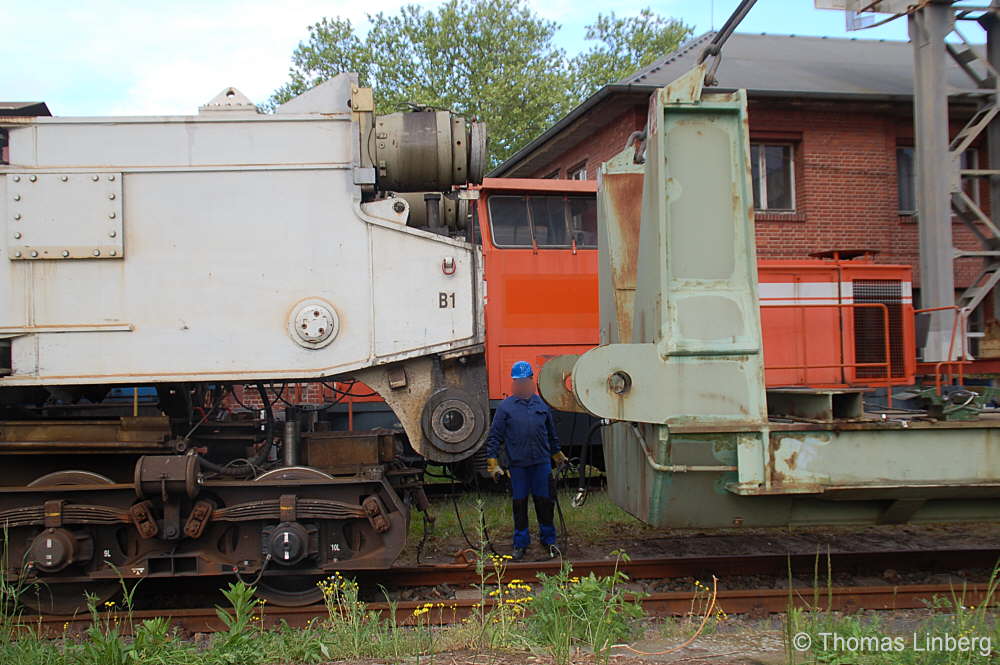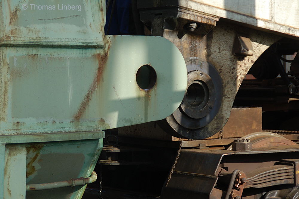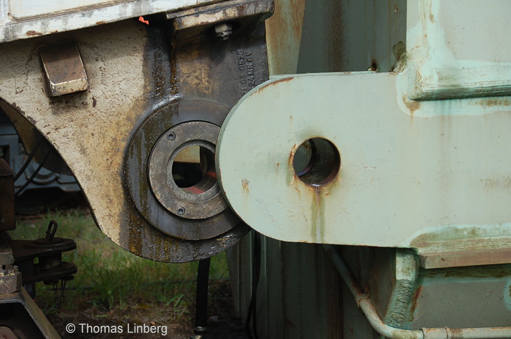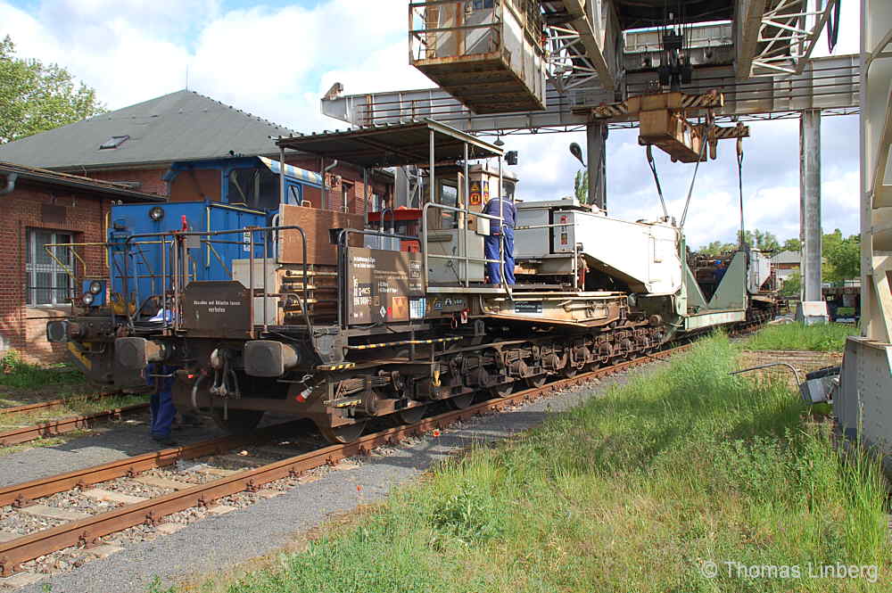 Bislang konnten die mit den Uaai 831 zu transportierenden Lasten entweder freitragend oder mit Durchladeträger transportiert werden. Am 13.05.2014 wurde in Brandenburg-Kirchmöser der Wagen 996 0 404 für einen Einsatz in Polen vorbereitet. Dazu wurde erstmals (ausgenommen von probeweisen Einbauten) ein Tiefbett eingebaut. Dieses wurde von MAN - Werk Gustavsburg - gebaut und hat bei einer Gesamtlänge von 11,9 m und einem Eigengewicht von 38,0 t eine maximale Tragfähigkeit von 190 t. Die Ladelänge beträgt 10,0 m und die Ladebreite 2,8 m. Das Tiefbett stammte ursprünglich vom Uaai 685.9 996 0 000, ist aber auch zur Verwendung mit den Uaai 684.9 und 687.9 zugelassen.. Nachfolgend zeige ich eine Bilderserie des Einbaus: Die beiden Hälften des Tragschnabelwagens sind bereits auseinandergezogen ... ![]() ... und während eine Hälfte wartet ... ![]() ... wird an der anderen Hälfte schon der Einbau des Tiefbetts vorbereitet. Das Tiefbett hängt an der Traverse der 100t-Kranbahn der GBM Gleisbaumechanik ... ![]() ... und wird Zentimeter für Zentimeter in Position gebracht. ![]() Noch ein Stück vor ... ![]() ... noch ein Stück tiefer ... ![]() ... zum Schluss geht es um Millimeter ... ![]() Passt! Bolzen rein! Festschrauben! Fertig! ![]() Die andere Hälfte ... wartet ![]() Für uns die nicht alltägliche Gelegenheit mal einen Blick ins "Innere" eines Tragschnabels zu werfen. ![]() Alles Warten hat ein Ende! Die zweite Hälfte ist an der Reihe und bewegt sich per Seilwinde und Muskelkraft Richtung Tiefbett ![]() Stück für Stück ... ![]() ... nähern sich Tragschnabel und Tiefbett Dann ist wieder Maßarbeit gefragt ... ![]() ![]() ![]() ![]() ... bis auch hier der Bolzen passt. ![]() So sieht die komplette Einheit aus, aber ... ![]() ... noch hängt das Tiefbett am Haken. ![]() Die Kopfpressen liegen an ... ![]() ... und so spricht nichts dagegen, das Tiefbett vom Haken zu lassen. Anschließend wurden noch einige Funktionsprüfungen durchgeführt ![]() Die tiefste Stellung - es fehlen nur Millimeter bis zur Schienenoberkante ... ![]() ... und eine höhere Stellung des Tiefbetts, wobei in dieser Position die höchste Stellung aber noch nicht erreicht ist. Außerdem wurde auch der Diagonalverschub gestestet. ![]() Eine Wagenhälfte verschiebt sich um maximal 450 mm zur einen Seite, die andere Wagenhälfte um maximal 450 mm zur anderen Seite. Zu erkennen ist das an den Bedienständen, die nicht mittig vor den "Wellblechdächern", sondern nach rechts bzw. links verschoben stehen. Vielen Dank an Heiko Kußmann für das Bild. ![]() Vorbehaltlich der Endabnahme kann das Fahrzeug zusammen mit dem frisch untersuchten und neu lackierten Begleitwagen 55 80 99-43 015-6 Dienst ümh 472 auf die Reise nach Polen gehen, um dort einen 150t-Trafo zu transportieren. Ich bedanke mich ganz herzlich bei der Nuclear Cargo + Service GmbH (NCS) und der GBM Gleisbaumechanik Brandenburg/H. GmbH (GBM), die mir die fotografische Begleitung dieser Umbauaktion ermöglichten. |