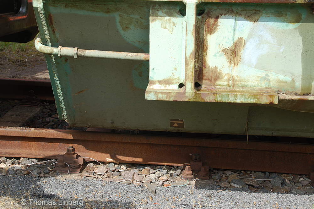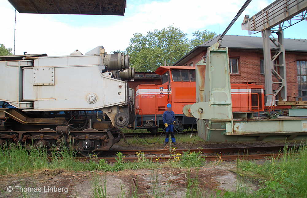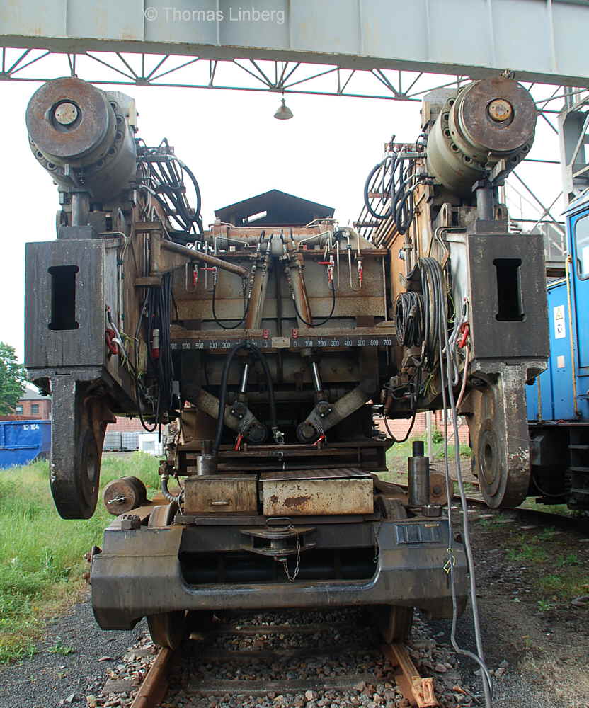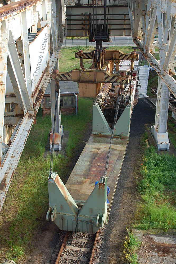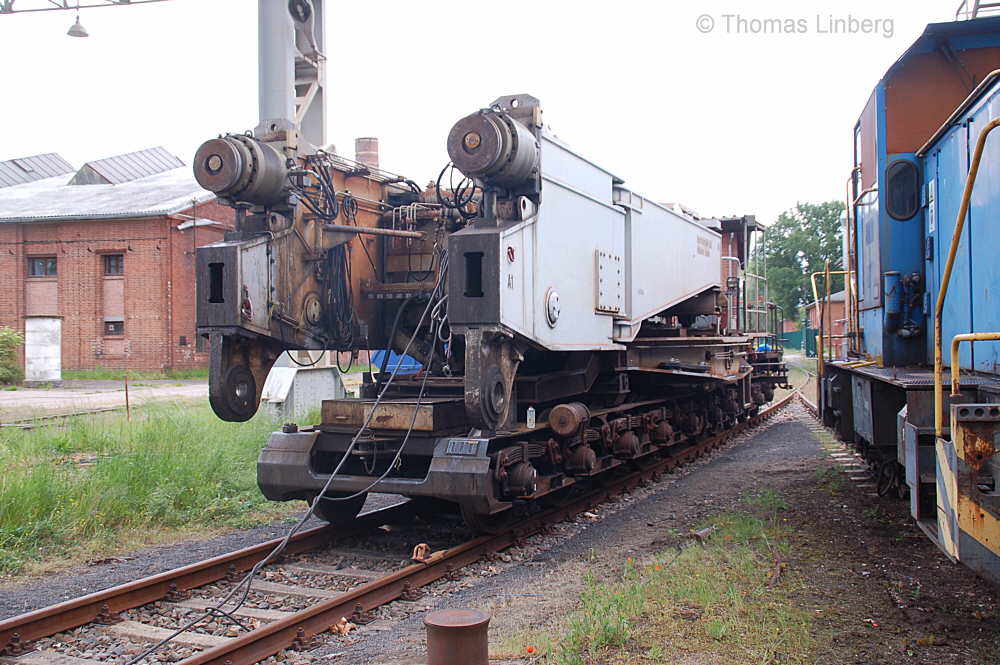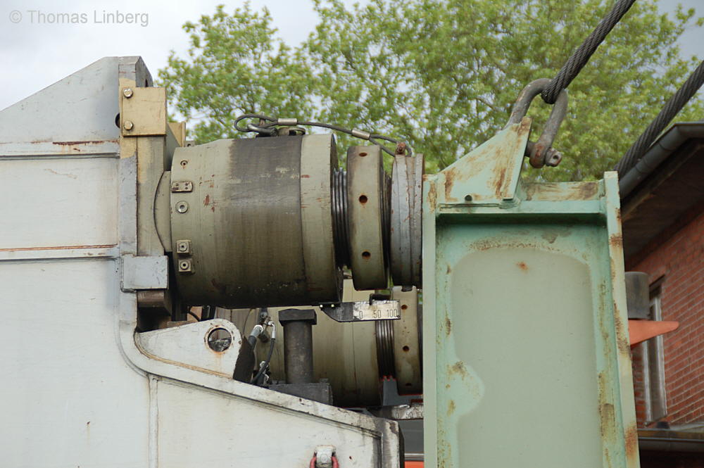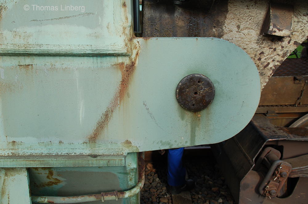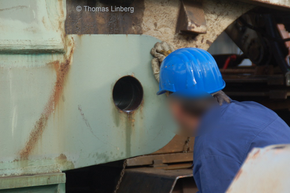 Bislang konnten die mit den Uaai 831 zu transportierenden Lasten entweder freitragend oder mit Durchladeträger transportiert werden. Am 13.05.2014 wurde in Brandenburg-Kirchmöser der Wagen 996 0 404 für einen Einsatz in Polen vorbereitet. Dazu wurde erstmals (ausgenommen von probeweisen Einbauten) ein Tiefbett eingebaut. Dieses wurde von MAN - Werk Gustavsburg - gebaut und hat bei einer Gesamtlänge von 11,9 m und einem Eigengewicht von 38,0 t eine maximale Tragfähigkeit von 190 t. Die Ladelänge beträgt 10,0 m und die Ladebreite 2,8 m. Das Tiefbett stammte ursprünglich vom Uaai 685.9 996 0 000, ist aber auch zur Verwendung mit den Uaai 684.9 und 687.9 zugelassen.. Nachfolgend zeige ich eine Bilderserie des Einbaus: Die beiden Hälften des Tragschnabelwagens sind bereits auseinandergezogen ... ![]() ... und während eine Hälfte wartet ... ![]() ... wird an der anderen Hälfte schon der Einbau des Tiefbetts vorbereitet. Das Tiefbett hängt an der Traverse der 100t-Kranbahn der GBM Gleisbaumechanik ... ![]() ... und wird Zentimeter für Zentimeter in Position gebracht. ![]() Noch ein Stück vor ... ![]() ... noch ein Stück tiefer ... ![]() ... zum Schluss geht es um Millimeter ... ![]() Passt! Bolzen rein! Festschrauben! Fertig! ![]() Die andere Hälfte ... wartet ![]() Für uns die nicht alltägliche Gelegenheit mal einen Blick ins "Innere" eines Tragschnabels zu werfen. ![]() Alles Warten hat ein Ende! Die zweite Hälfte ist an der Reihe und bewegt sich per Seilwinde und Muskelkraft Richtung Tiefbett ![]() Stück für Stück ... ![]() ... nähern sich Tragschnabel und Tiefbett Dann ist wieder Maßarbeit gefragt ... ![]() ![]() ![]() ![]() ... bis auch hier der Bolzen passt. ![]() So sieht die komplette Einheit aus, aber ... ![]() ... noch hängt das Tiefbett am Haken. ![]() Die Kopfpressen liegen an ... ![]() ... und so spricht nichts dagegen, das Tiefbett vom Haken zu lassen. Anschließend wurden noch einige Funktionsprüfungen durchgeführt ![]() Die tiefste Stellung - es fehlen nur Millimeter bis zur Schienenoberkante ... ![]() ... und eine höhere Stellung des Tiefbetts, wobei in dieser Position die höchste Stellung aber noch nicht erreicht ist. Außerdem wurde auch der Diagonalverschub gestestet. ![]() Eine Wagenhälfte verschiebt sich um maximal 450 mm zur einen Seite, die andere Wagenhälfte um maximal 450 mm zur anderen Seite. Zu erkennen ist das an den Bedienständen, die nicht mittig vor den "Wellblechdächern", sondern nach rechts bzw. links verschoben stehen. Vielen Dank an Heiko Kußmann für das Bild. ![]() Vorbehaltlich der Endabnahme kann das Fahrzeug zusammen mit dem frisch untersuchten und neu lackierten Begleitwagen 55 80 99-43 015-6 Dienst ümh 472 auf die Reise nach Polen gehen, um dort einen 150t-Trafo zu transportieren. Ich bedanke mich ganz herzlich bei der Nuclear Cargo + Service GmbH (NCS) und der GBM Gleisbaumechanik Brandenburg/H. GmbH (GBM), die mir die fotografische Begleitung dieser Umbauaktion ermöglichten. |