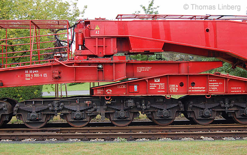 1) bei einer Einhängelänge = 13.000 mm 2) unbeladen; beladen ladegutabhängig ≤ 65 km/h 3) je Drehgestell; insgesamt 6 4-achsige Drehgestelle 4) ohne Durchladeträger / 313,0 t mit Durchladeträger |